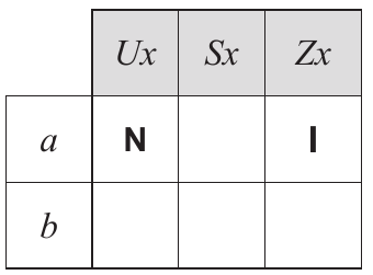 Prema zadanome tumačenju u tablicu upišite $\mathbf{I}$ za istinu, a $\mathbf{N}$ za neistinu tako da stanje stvari u tablici bude protuprimjer navedenomu zaključku, tj. da prema tome stanju stvari premise budu istinite, a konkluzija neistinita. U tablicu su već upisane vrijednosti koje su nam poznate.