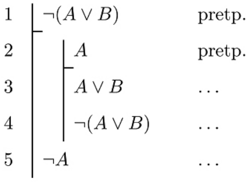 U sljedećemu dokazu provedenom naravnom (prirodnom) dedukcijom odredite što treba pisati u dijelovima koji su označeni trima točkicama (...). Kao naziv pravila upotrijebite oznake 'u' i 'i' napisane ispred logičkoga znaka koji se uvodi ili isključuje (npr. ' $i \vee$ ' za 'isključenje disjunkcije') te 'op.' za 'pravilo opetovanja', a za oznaku pretpostavke upotrijebite 'pretp.'.