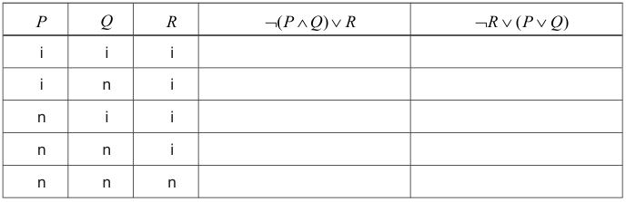 Popunite tablice istinitosti. Upišite samo konačnu vrijednost istinitosti rečenica za svako traženo tumačenje jednostavnih sudova.