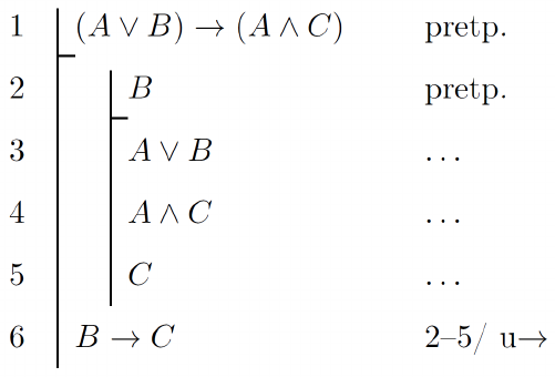 U sljedećemu dokazu provedenom naravnom (prirodnom) dedukcijom odredite što treba pisati u dijelovima koji su označeni trima točkicama (...). Kao naziv pravila upotrebljavajte oznake 'u' i 'i' napisane ispred logičkoga znaka koji se uvodi ili isključuje (npr. ' $i \vee$ ' za 'isključivanje disjunkcije') te 'op.' za pravilo opetovanja, odnosno ponavljanja, a za oznaku pretpostavke upotrebljavajte 'pretp.'.