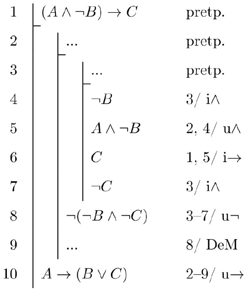 U sljedećemu dokazu provedenom naravnom (prirodnom) dedukcijom odredite sudove koji nedostaju u redcima u kojima su upisane tri točkice (...), a koji dokaz u cjelini čine točnim.