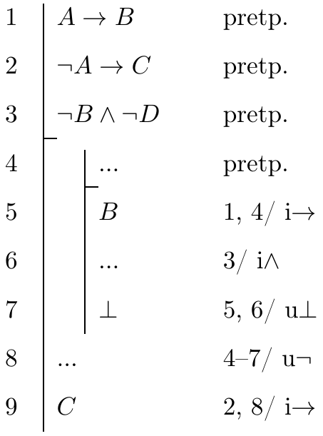 U sljedećemu dokazu provedenom naravnom (prirodnom) dedukcijom odredite sudove koji nedostaju u redcima u kojima su upisane tri točkice (...), a koji dokaz u cjelini čine točnim. Kao naziv pravila upotrijebite oznake 'u' i 'i' napisane ispred logičkoga znaka koji se uvodi ili isključuje (npr. ‘iv’ za ‘isključenje disjunkcije’) te ‘op.’ za ‘pravilo opetovanja’ (ponavljanja, reiteracije), a za oznaku pretpostavke upotrijebite 'pretp.'.