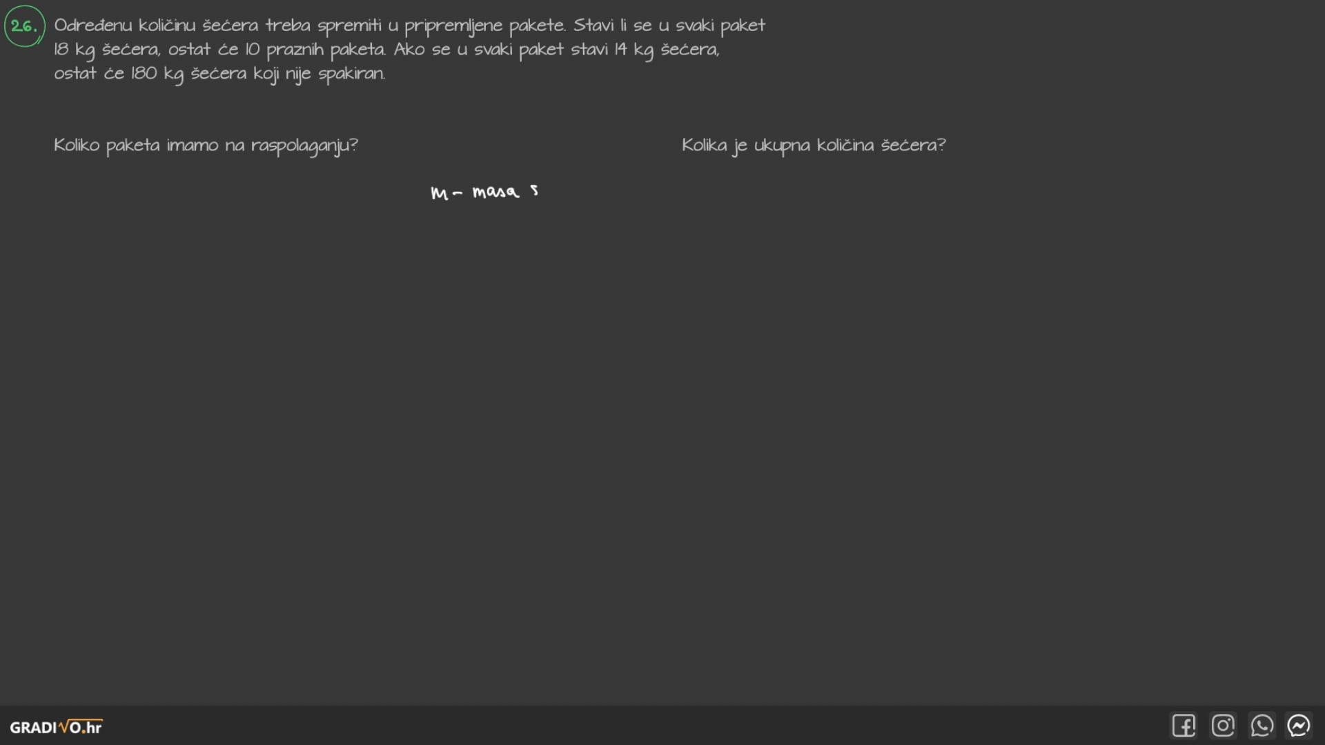 Određenu količinu šećera treba spremiti u pripremljene pakete. Stavi li se u svaki paket18 kg šećera, ostat će 10 praznih paketa. Ako se u svaki paket stavi 14 kg šećera,ostat će 180 kg šećera koji nije spakiran.