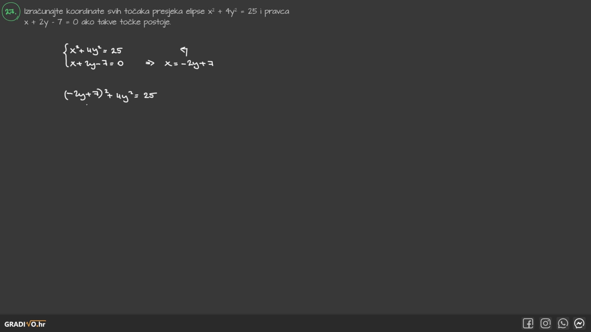Izračunajte koordinate svih točaka presjeka elipse \(x^{2}+4 y^{2}=25\) i pravca \(x+2 y-7=0\) ako takve točke postoje.