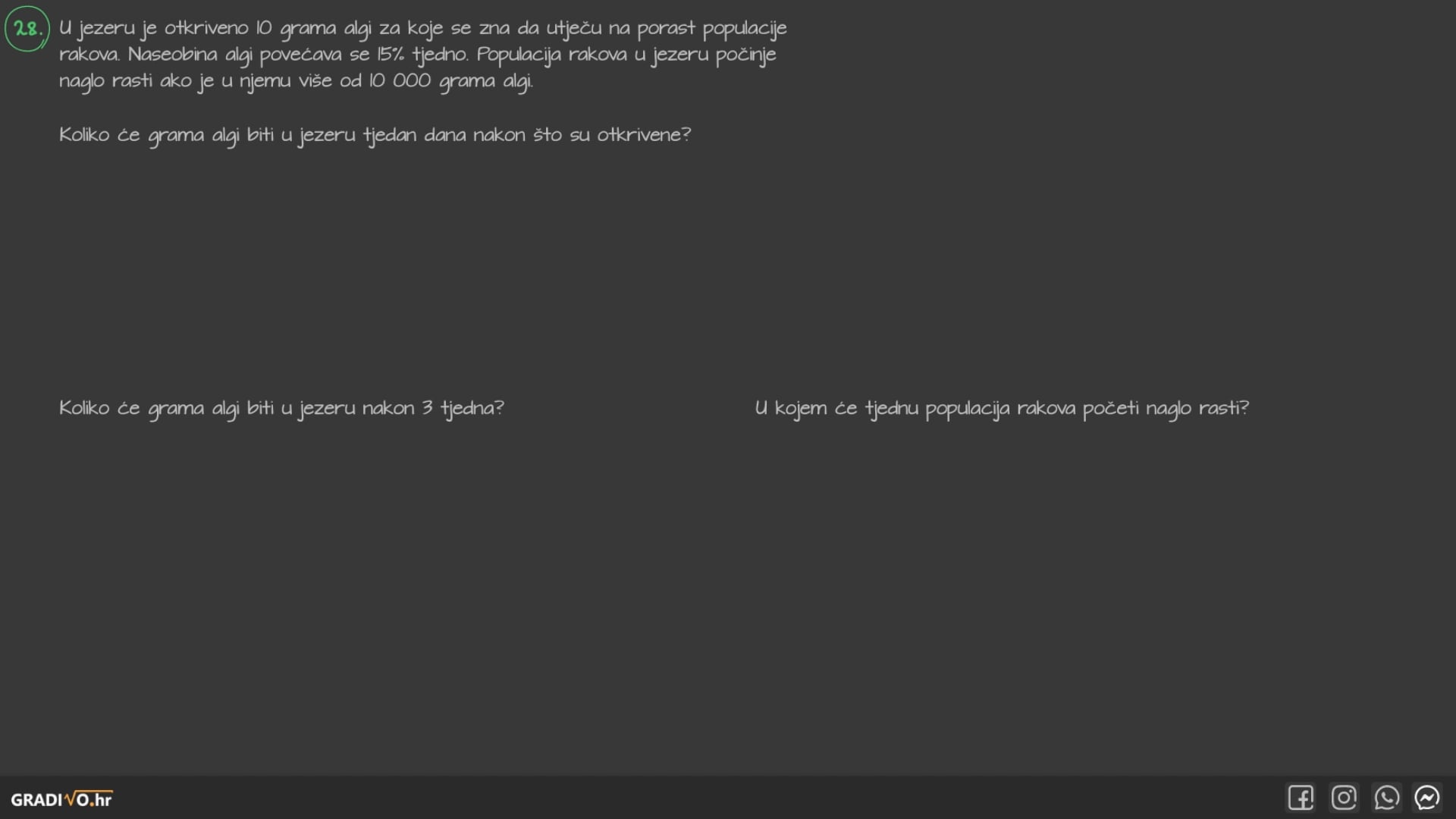 28.2. Koliko će grama algi biti u jezeru nakon 3 tjedna?
