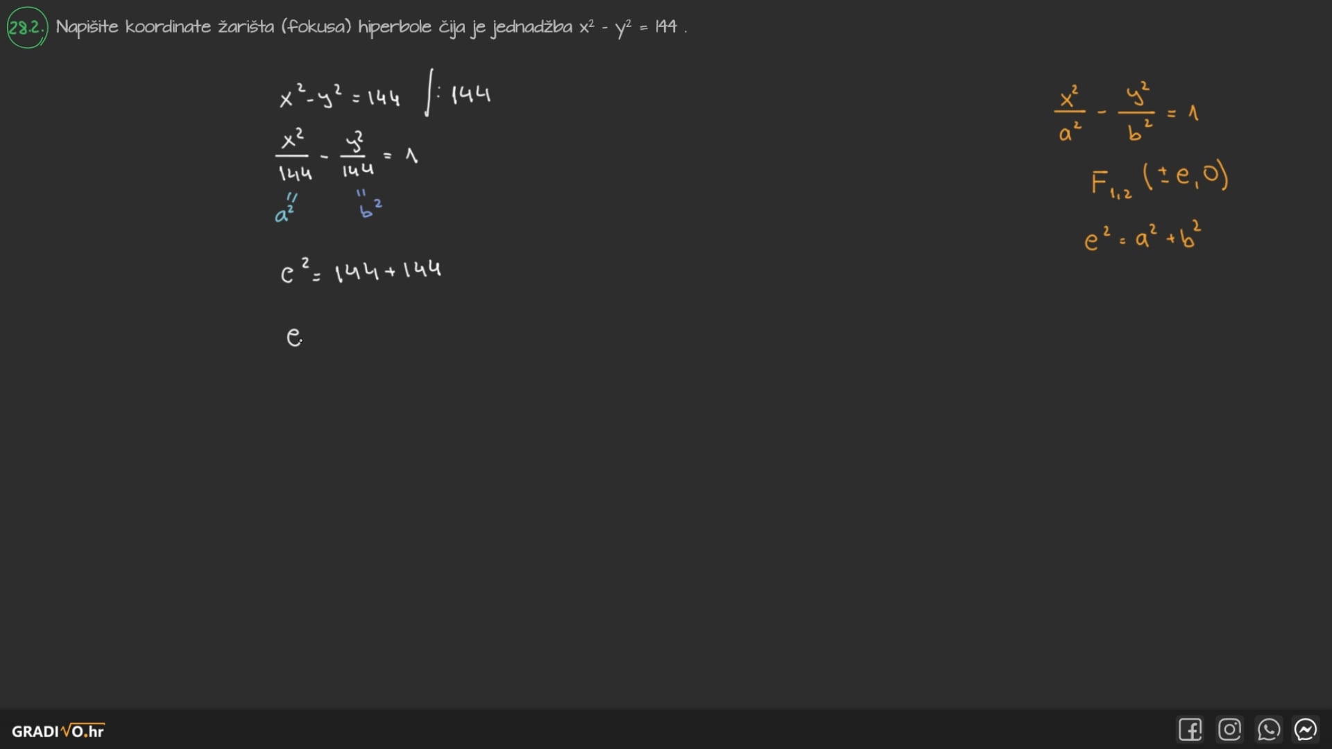 Napišite koordinate žarišta (fokusa) hiperbole čija je jednadžba $x^{2}-y^{2}=144$.