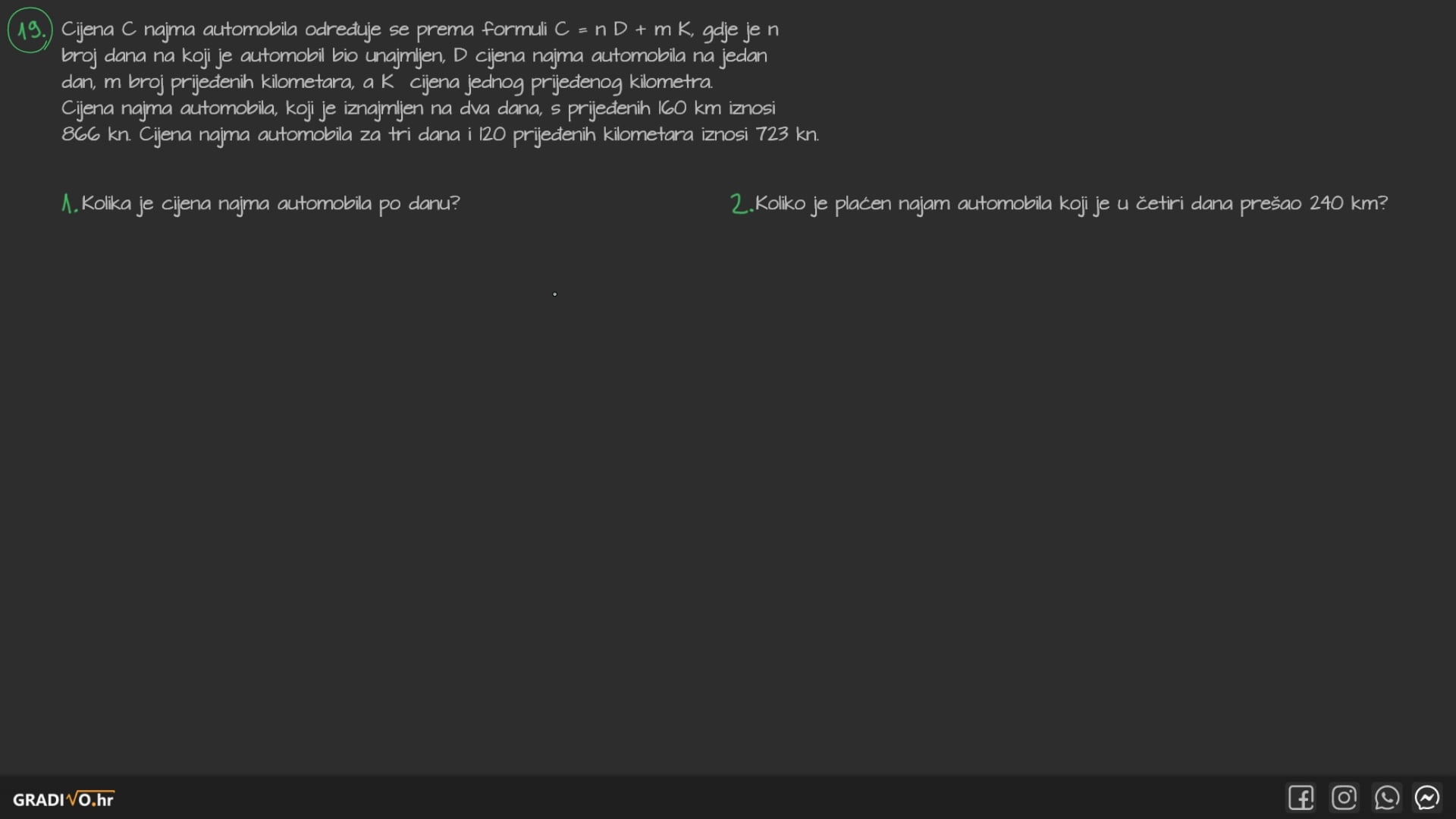Cijena $C$ najma automobila određuje se prema formuli $C=n \cdot D+m \cdot K$, gdje je $n$ broj dana na koji je automobil bio unajmljen, $D$ cijena najma automobila na jedan dan, $m$ broj prijeđenih kilometara, a $K$ cijena jednog prijeđenog kilometra. Cijena najma automobila, koji je iznajmljen na dva dana, s prijeđenih 160 km iznosi 866 kn. Cijena najma automobila za tri dana i 120 prijeđenih kilometara iznosi 723 kn.