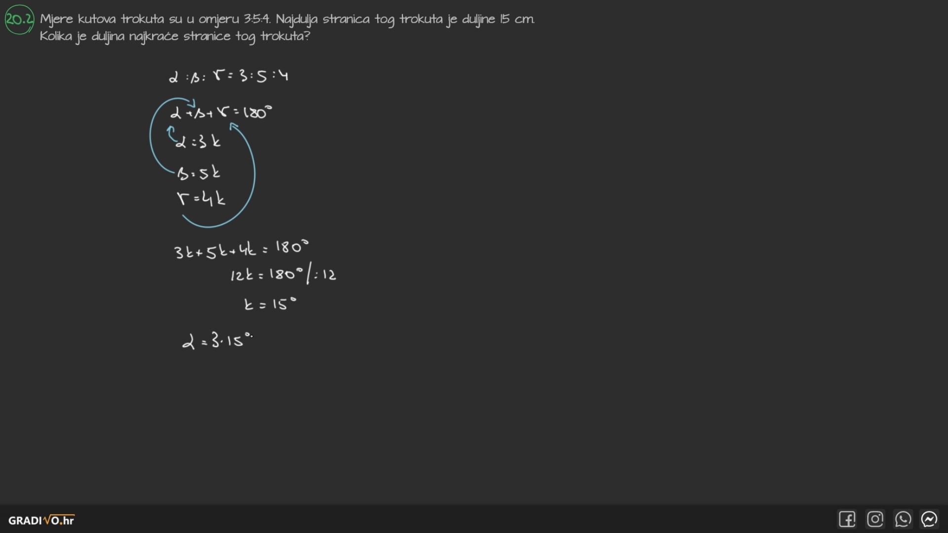 Mjere kutova trokuta su u omjeru $3: 5: 4$. Najdulja stranica tog trokuta je duljine 15 cm. Kolika je duljina najkraće stranice tog trokuta?