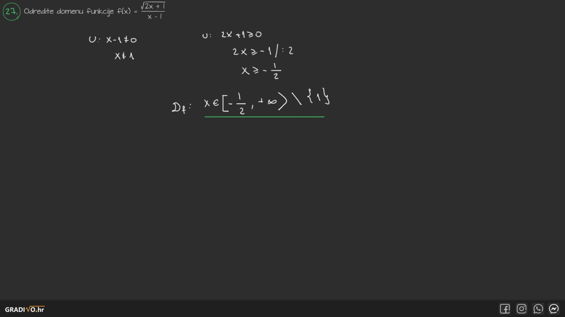 Odredite domenu funkcije $f(x)=\frac{\sqrt{2 x+1}}{x-1}$.