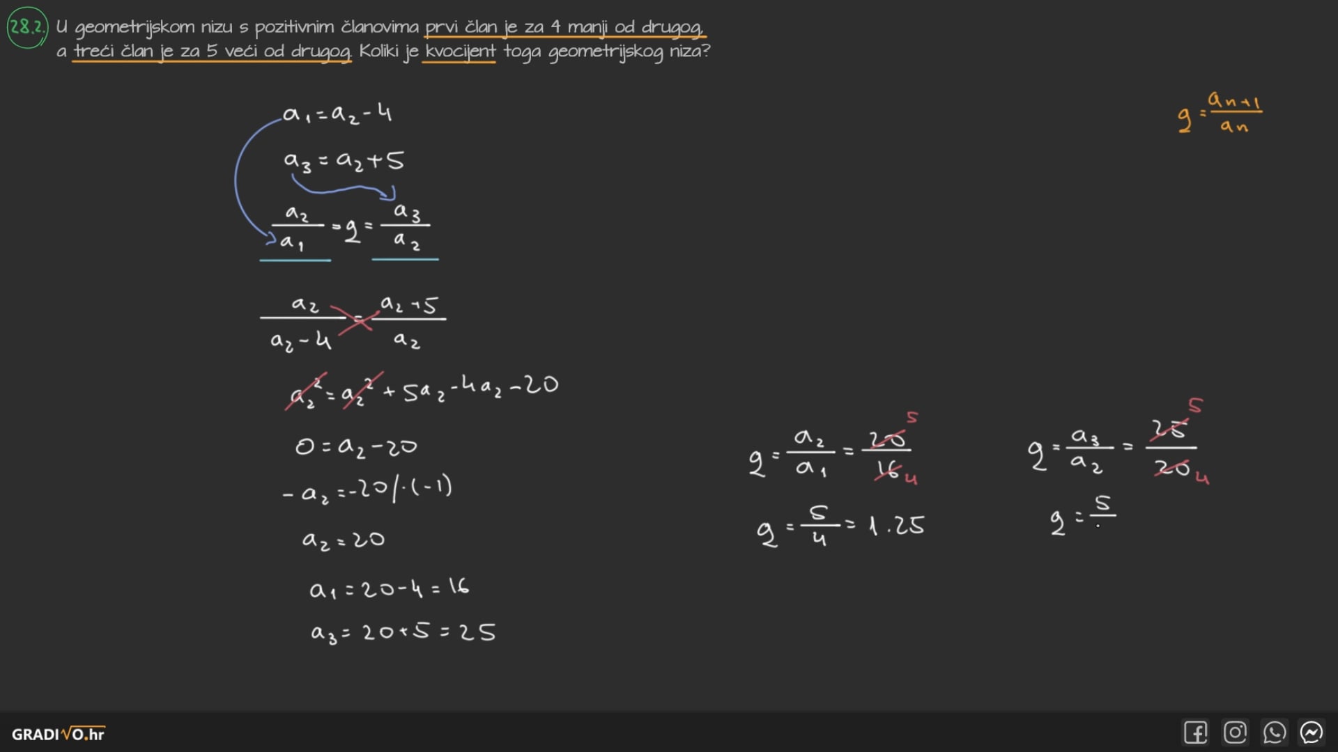 U geometrijskom nizu s pozitivnim članovima prvi član je za 4 manji od drugog,a treći član je za 5 veći od drugog. Koliki je kvocijent toga geometrijskog niza?