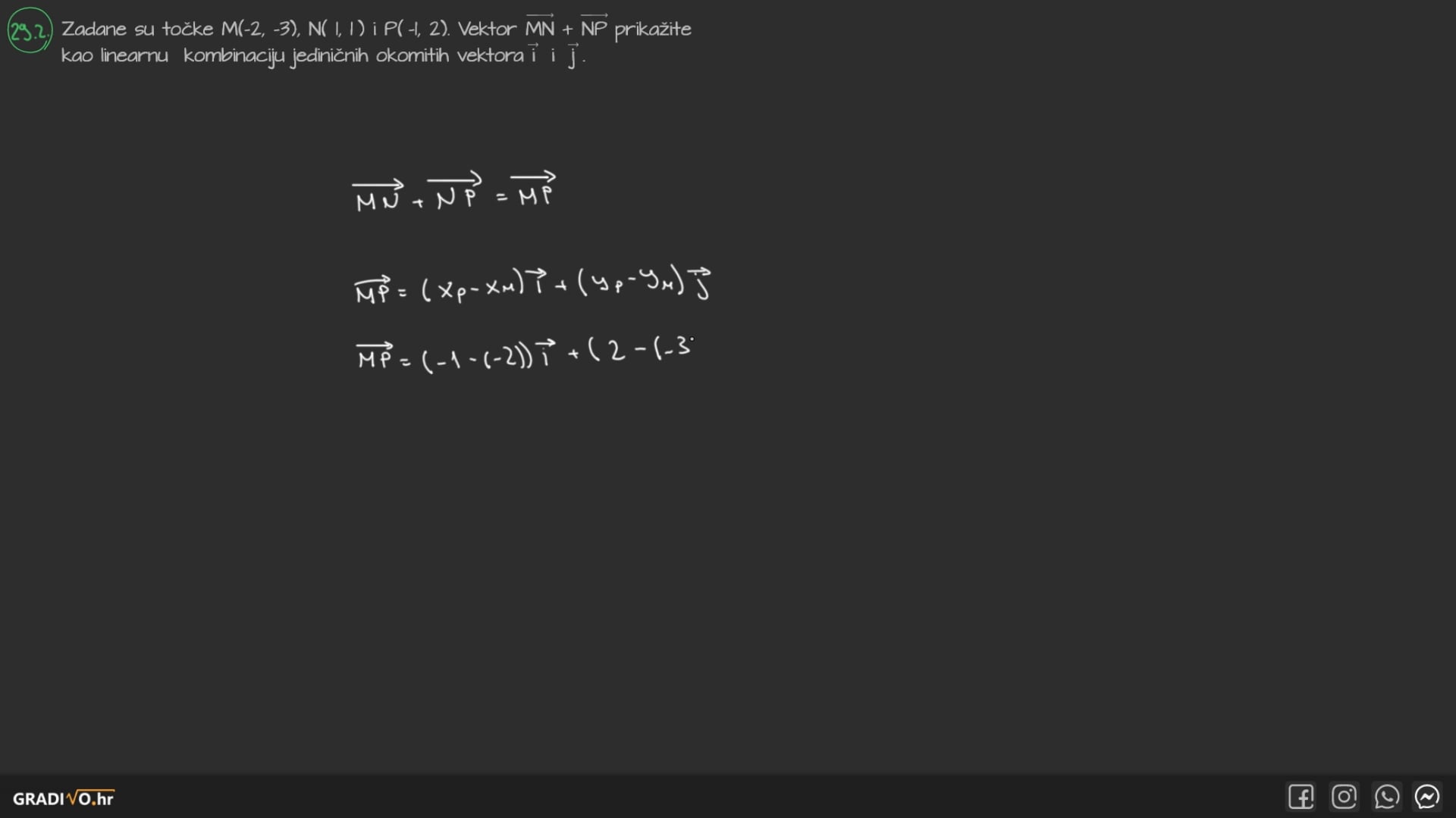 Zadane su točke \(M(-2,-3)\), \(N(1,1)\) i \(P(-1,2)\). Vektor \(\overrightarrow{M N}+\overrightarrow{N P}\) prikažite kao linearnu kombinaciju jediničnih okomitih vektora \(\vec{i}\) i \(\vec{j}\).