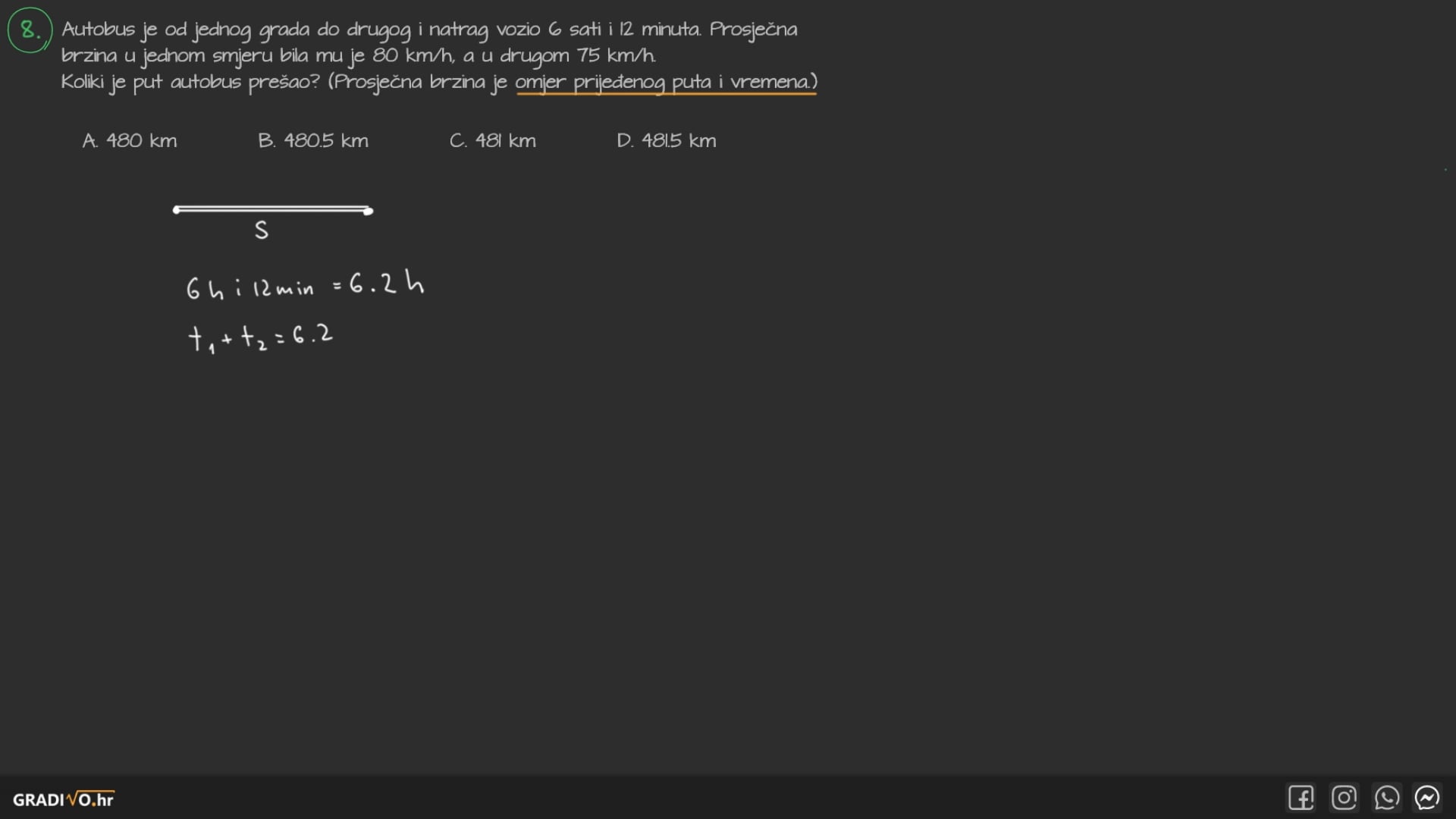 Autobus je od jednog grada do drugog i natrag vozio 6 sati i 12 minuta. Prosječna brzina u jednom smjeru bila mu je 80 km/h, a u drugom 75 km/h. Koliki je put autobus prešao? (Prosječna brzina je omjer prijeđenog puta i vremena.)