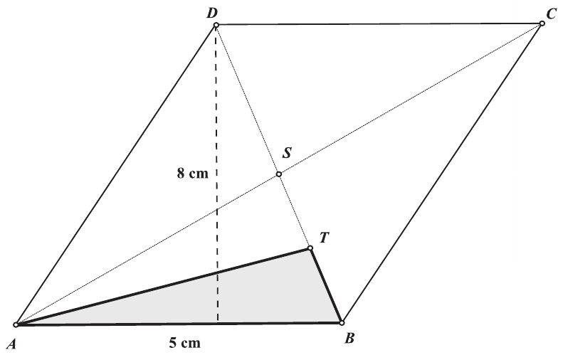 Na skici je prikazan paralelogram $A B C D$ kojemu je stranica $\overline{A B}$ duljine 5 cm , a visina na tu stranicu 8 cm . Točka $S$ je sjecište njegovih dijagonala, a točka $T$ polovište dužine $\overline{B S}$. Izračunajte površinu trokuta $A B T$.
