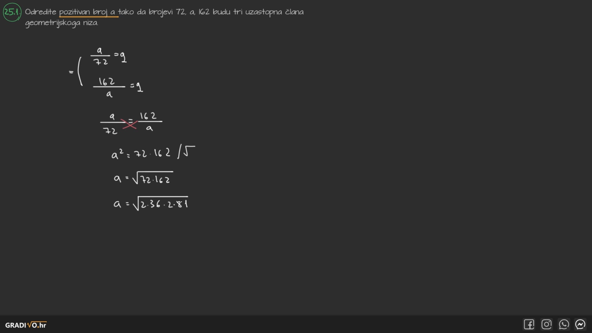 Odredite pozitivan broj $a$ tako da brojevi $72, a, 162$ budu tri uzastopna člana geometrijskoga niza.