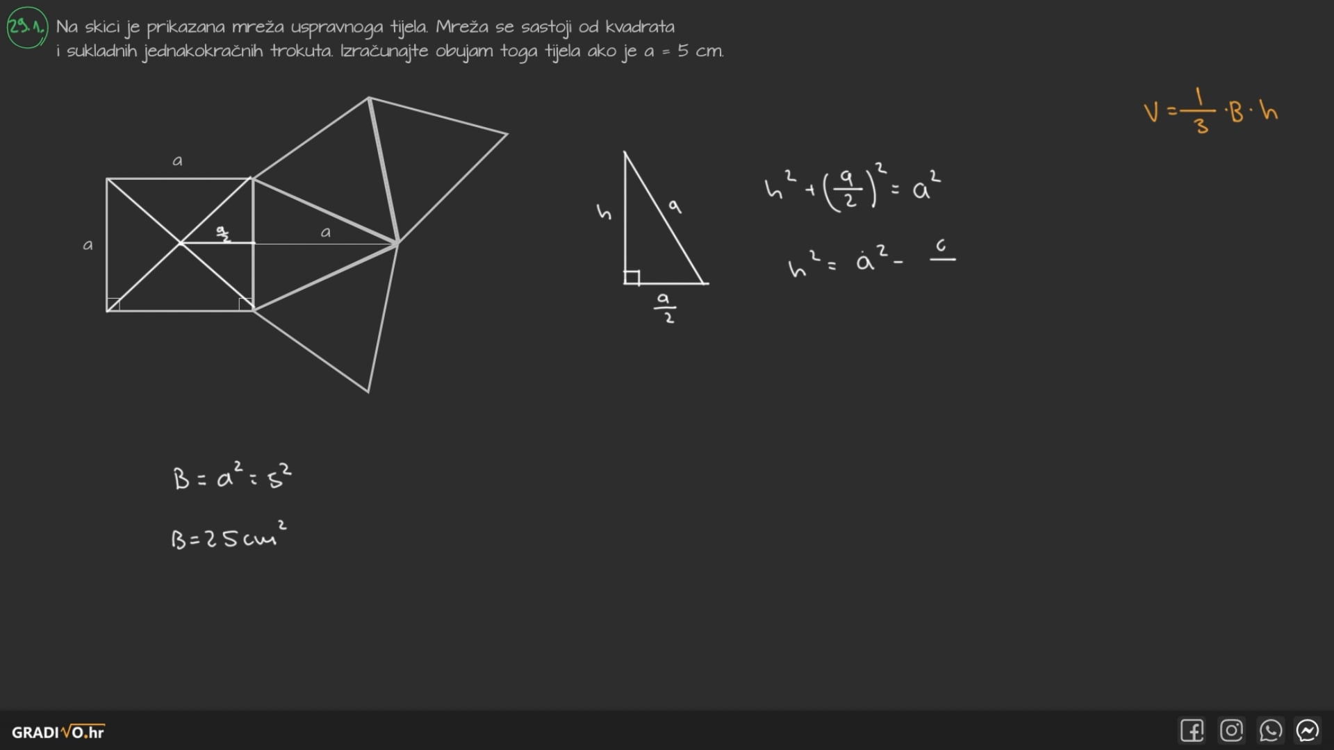 Na skici je prikazana mreža uspravnoga tijela. Mreža se sastoji od kvadrata i sukladnih jednakokračnih trokuta. Izračunajte obujam toga tijela ako je $a=5 \mathrm{~cm}$.