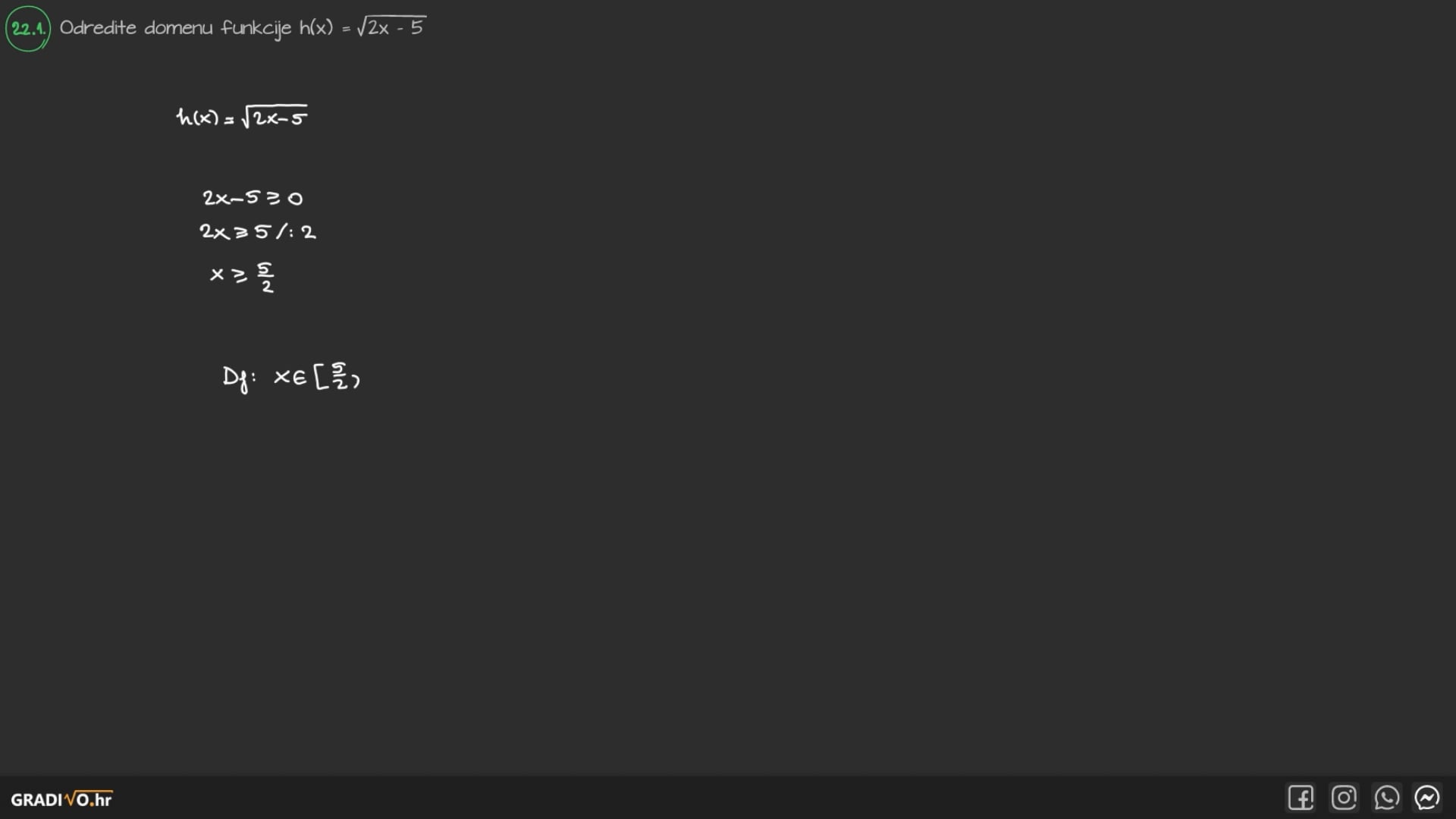 Odredite domenu funkcije $h(x)=\sqrt{2 x-5}$.