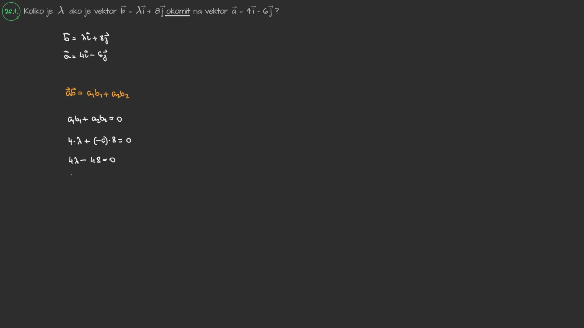 Koliko je $\lambda$ ako je vektor $\vec{b}=\lambda \vec{i}+8 \vec{j}$ okomit na vektor $\vec{a}=4 \vec{i}-6 \vec{j}$ ?