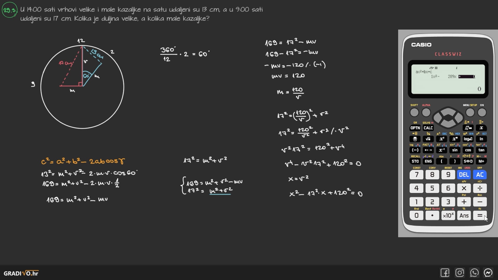 U 14:00 sati vrhovi velike i male kazaljke na satu udaljeni su 13 cm , a u 9:00 sati udaljeni su 17 cm . Kolika je duljina velike, a kolika male kazaljke?