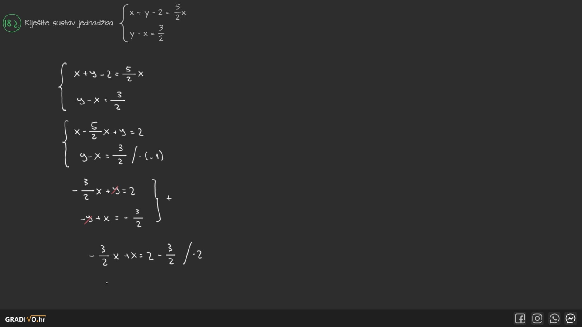 Riješite sustav jednadžba $\left\{\begin{array}{l}x+y-2=\frac{5}{2} x \\ y-x=\frac{3}{2}\end{array}\right.$.