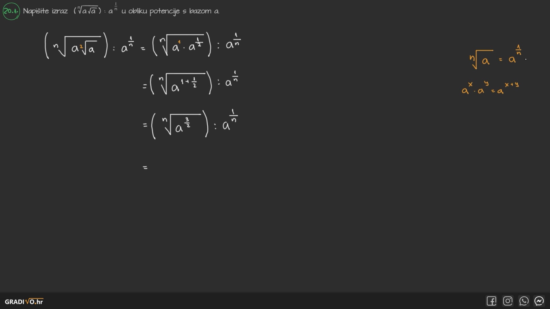 Napišite izraz $(\sqrt[n]{a \sqrt{a}}): a^{\frac{1}{n}}$ u obliku potencije s bazom $a$.