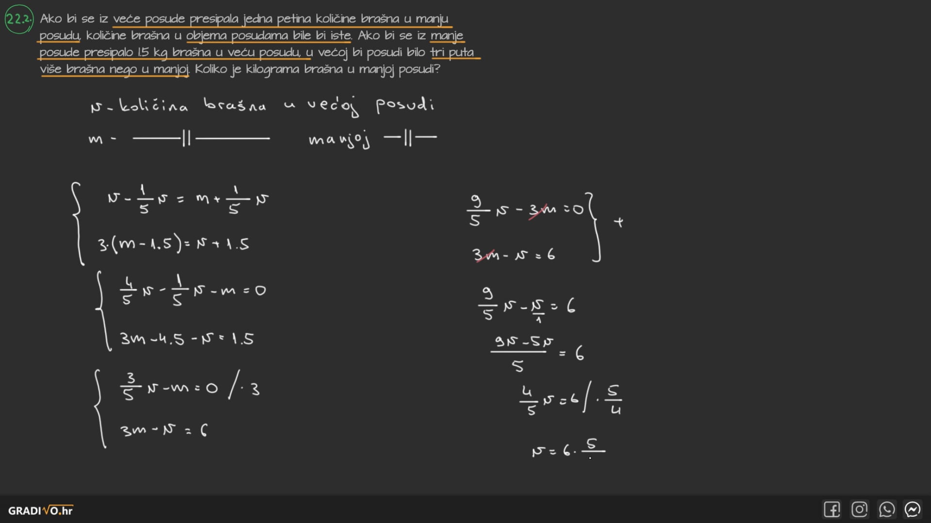 Ako bi se iz veće posude presipala jedna petina količine brašna u manju posudu, količine brašna u objema posudama bile bi iste. Ako bi se iz manje posude presipalo 1.5 kg brašna u veću posudu, u većoj bi posudi bilo tri puta više brašna nego u manjoj. Koliko je kilograma brašna u manjoj posudi?