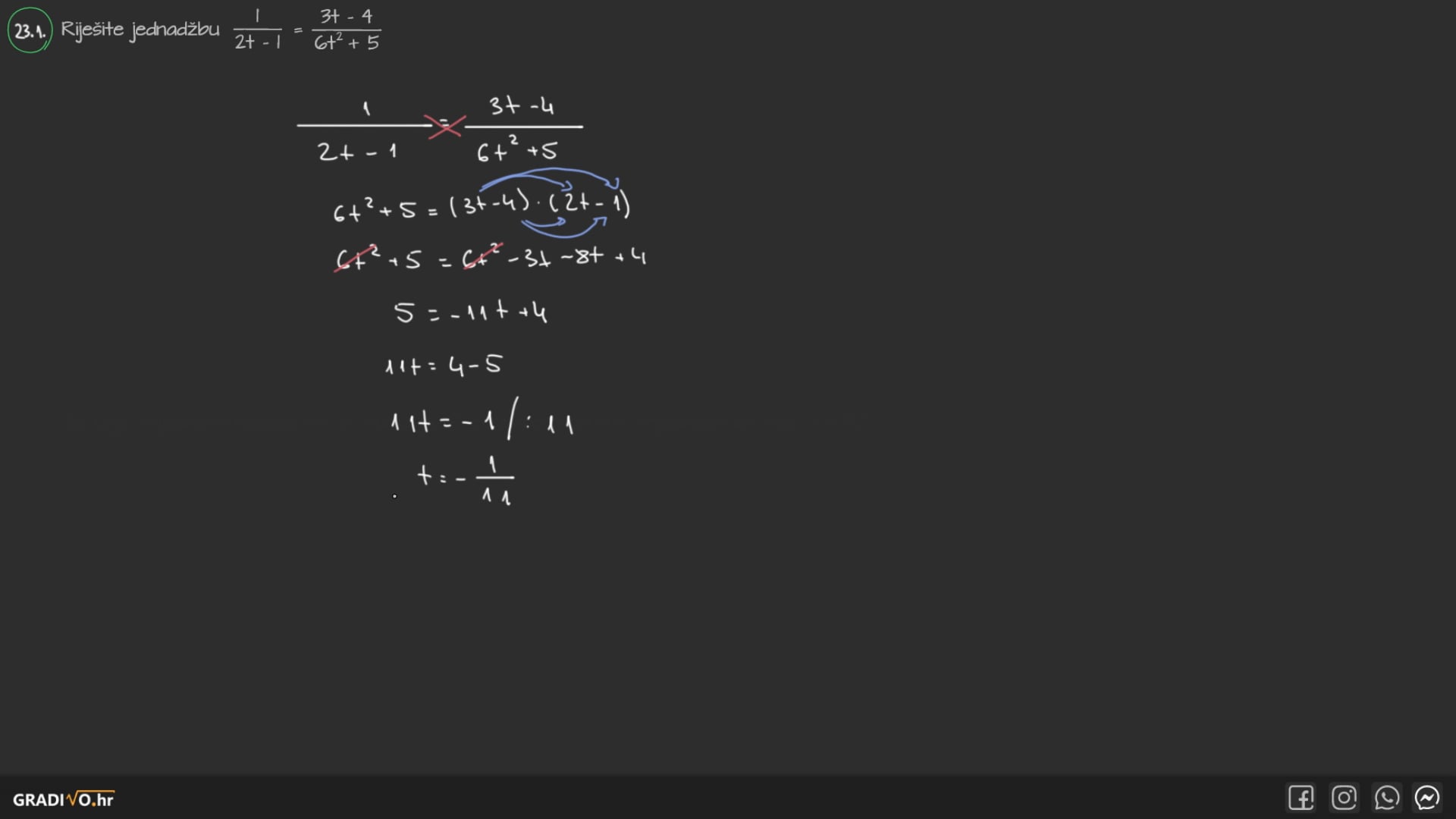 Riješite jednadžbu $\frac{1}{2 t-1}=\frac{3 t-4}{6 t^{2}+5}$.
