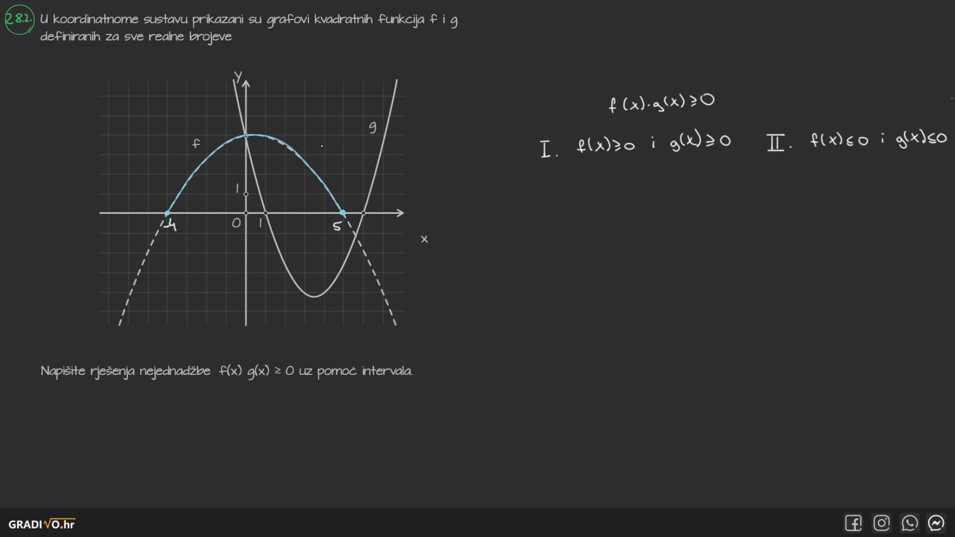 Napišite rješenja nejednadžbe $f(x) \cdot g(x) \geq 0$ uz pomoć intervala.