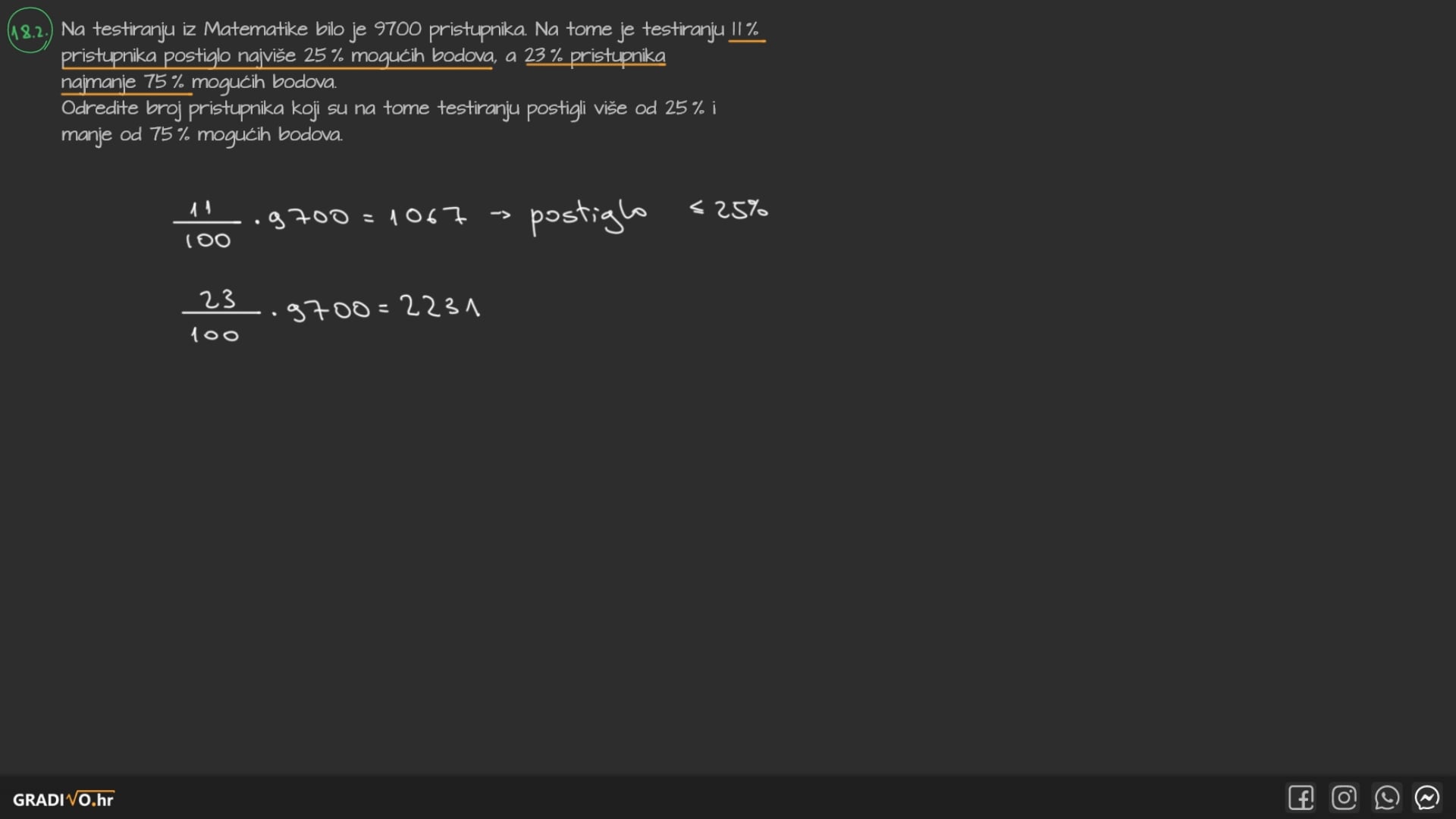 Na testiranju iz Matematike bilo je 9700 pristupnika. Na tome je testiranju $11 \%$ pristupnika postiglo najviše $25 \%$ mogućih bodova, a $23 \%$ pristupnika najmanje $75 \%$ mogućih bodova. Odredite broj pristupnika koji su na tome testiranju postigli više od $25 \%$ i manje od $75 \%$ mogućih bodova.