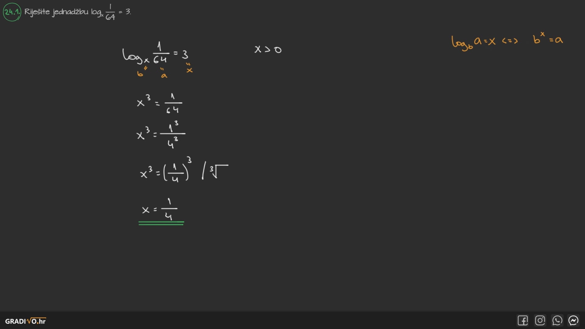 Riješite jednadžbu $\log _{x} \frac{1}{64}=3$.