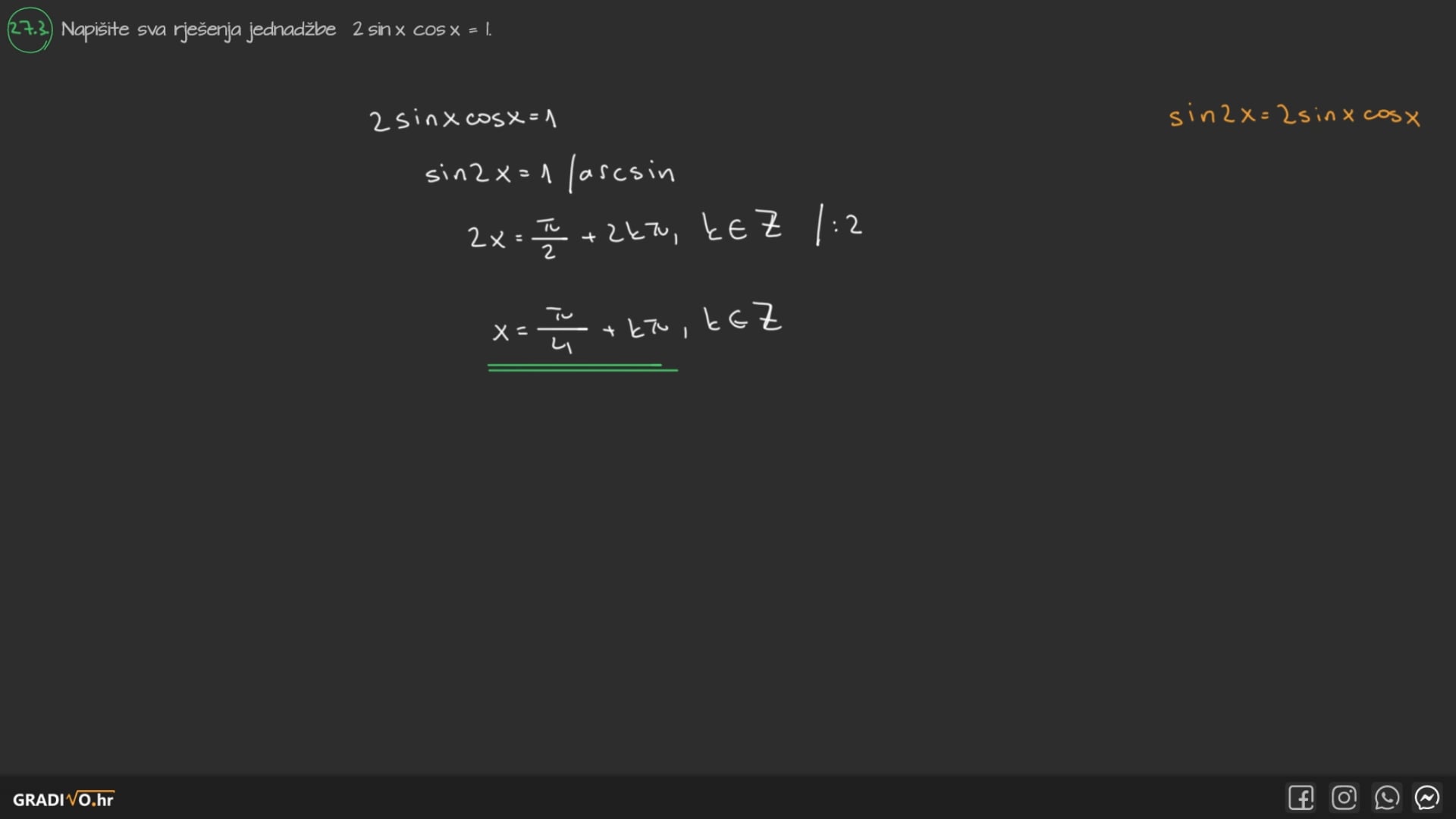 Napišite sva rješenja jednadžbe $2 \sin x \cdot \cos x=1$.