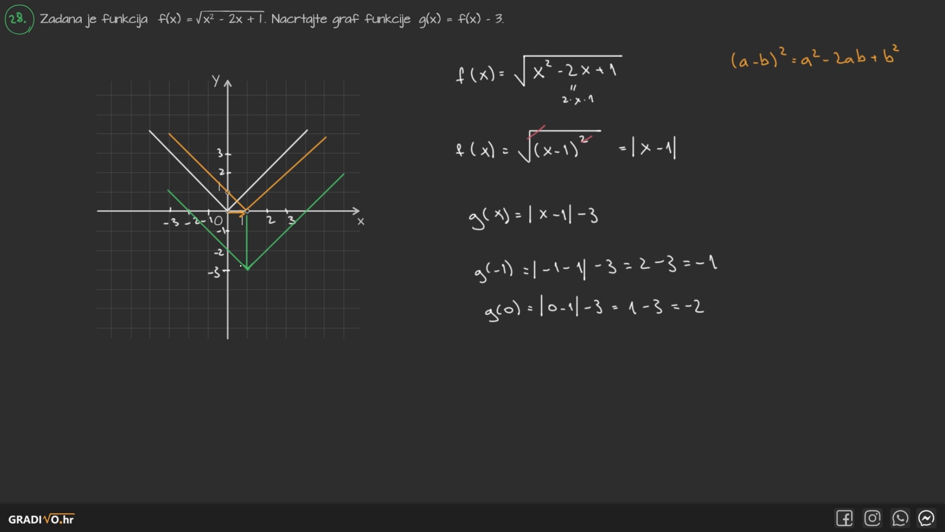 Zadana je funkcija $f(x)=\sqrt{x^{2}-2 x+1}$. Nacrtajte graf funkcije $g(x)=f(x)-3$.