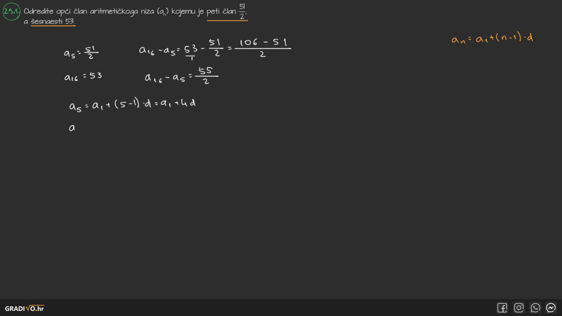 Odredite opći član aritmetičkoga niza $\left(a_{n}\right)$ kojemu je peti član $\frac{51}{2}$, a šesnaesti 53.