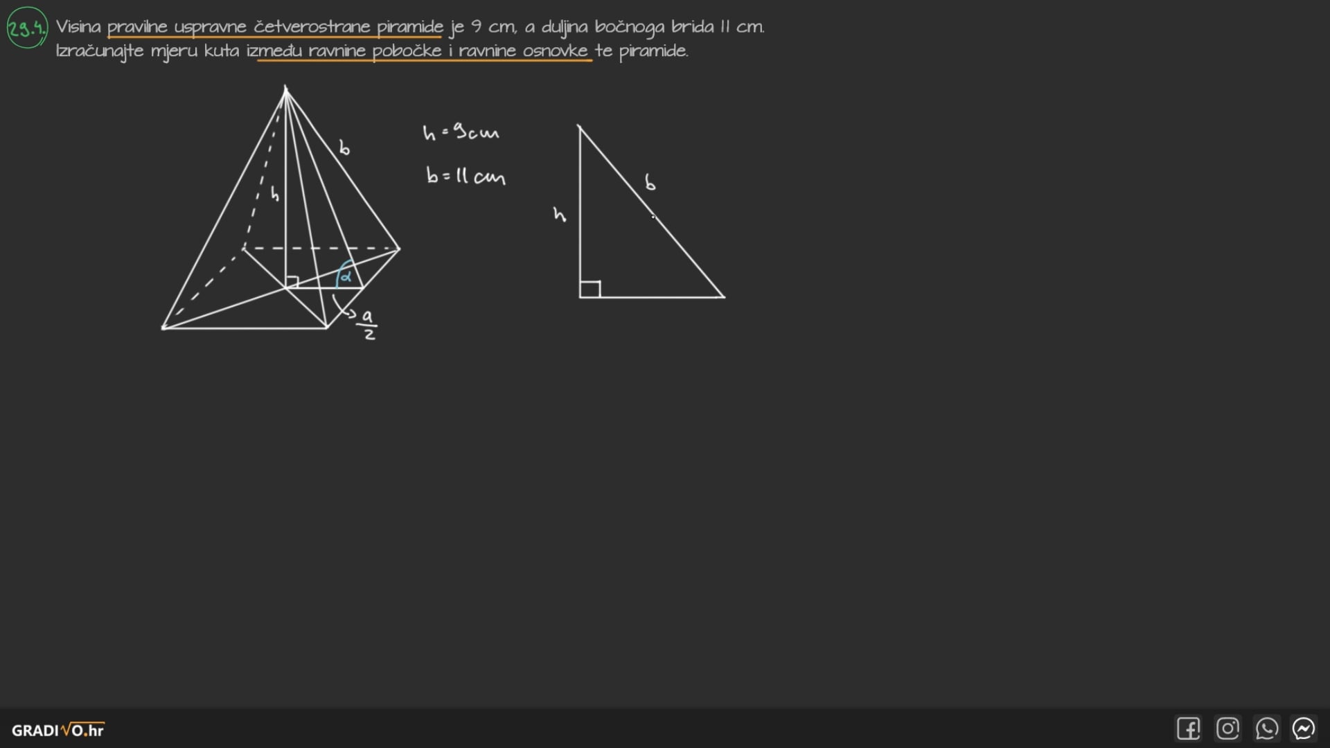 Izračunajte mjeru kuta između ravnine pobočke i ravnine osnovke te piramide.