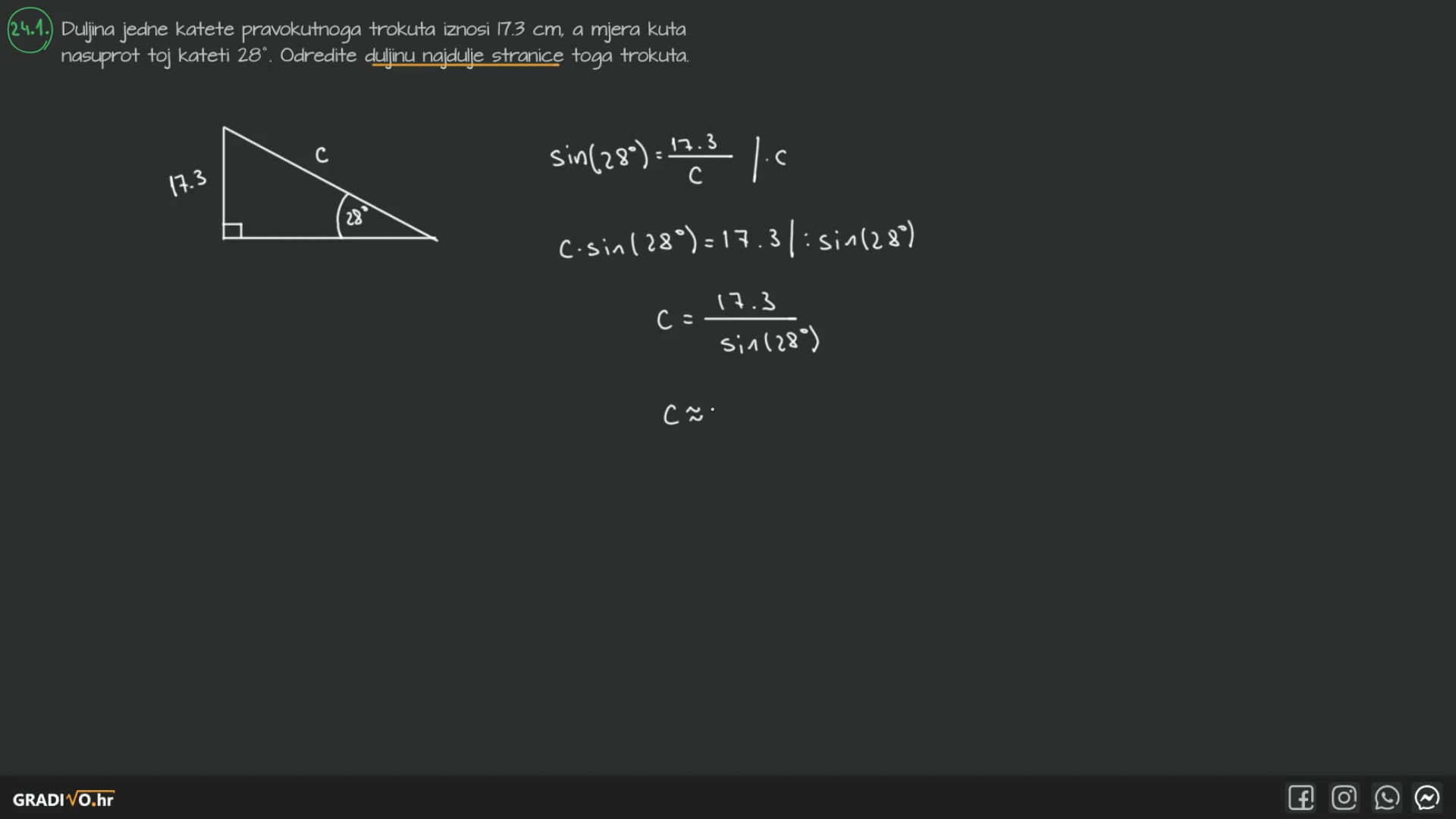 Duljina jedne katete pravokutnoga trokuta iznosi 17.3 cm, a mjera kuta nasuprot toj kateti $28^{\circ}$. Odredite duljinu najdulje stranice toga trokuta.