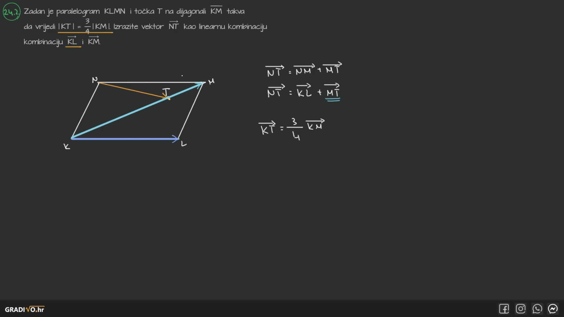 Zadan je paralelogram $K L M N$ i točka $T$ na dijagonali $\overline{K M}$ takva da vrijedi $|K T|=\frac{3}{4}|K M|$. |zrazite vektor $\overrightarrow{N T}$ kao linearnu kombinaciju vektora $\overrightarrow{K L}$ i $\overrightarrow{K M}$.