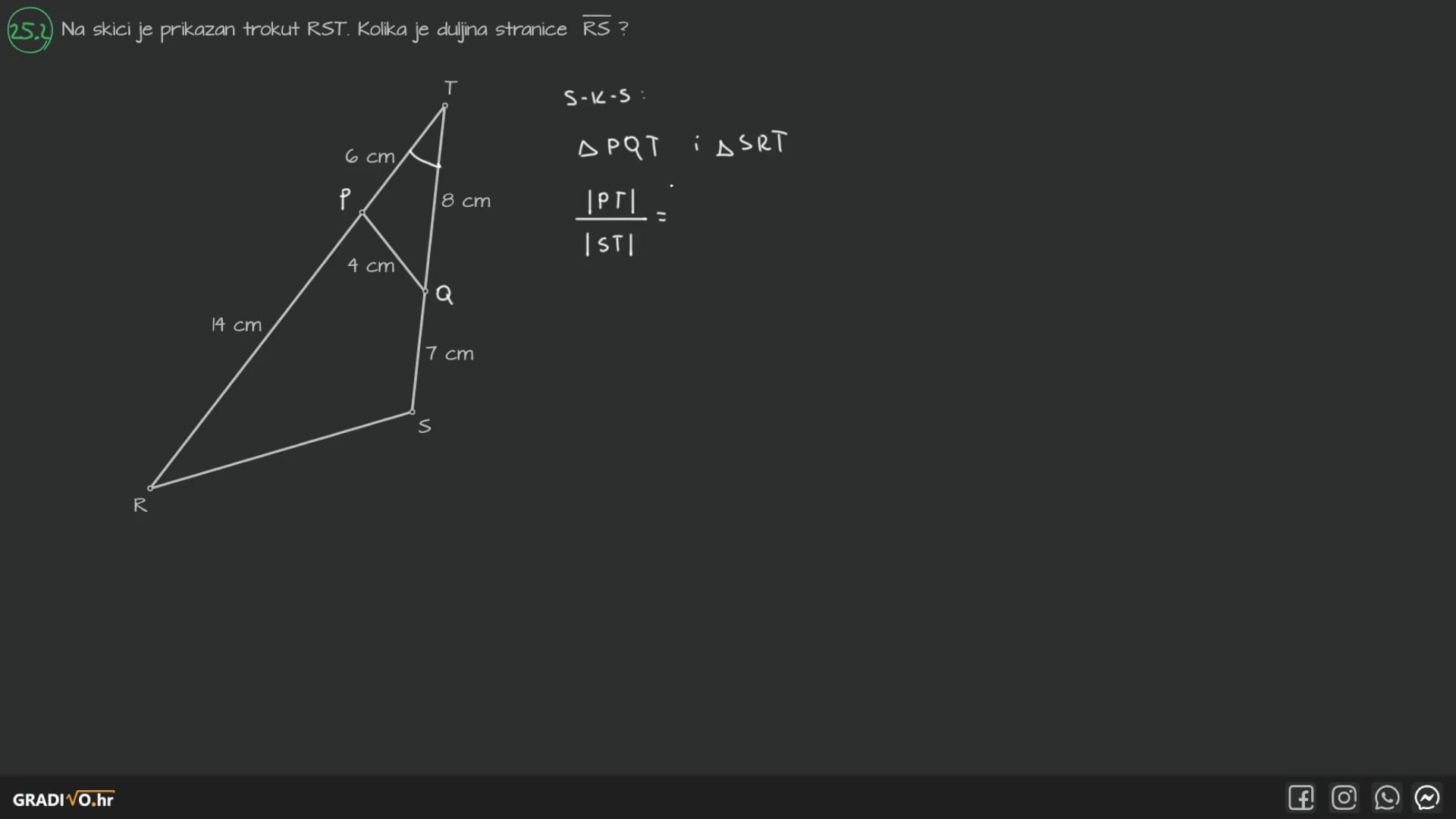 Na skici je prikazan trokut $R S T$. Kolika je duljina stranice $\overline{R S}$ ?