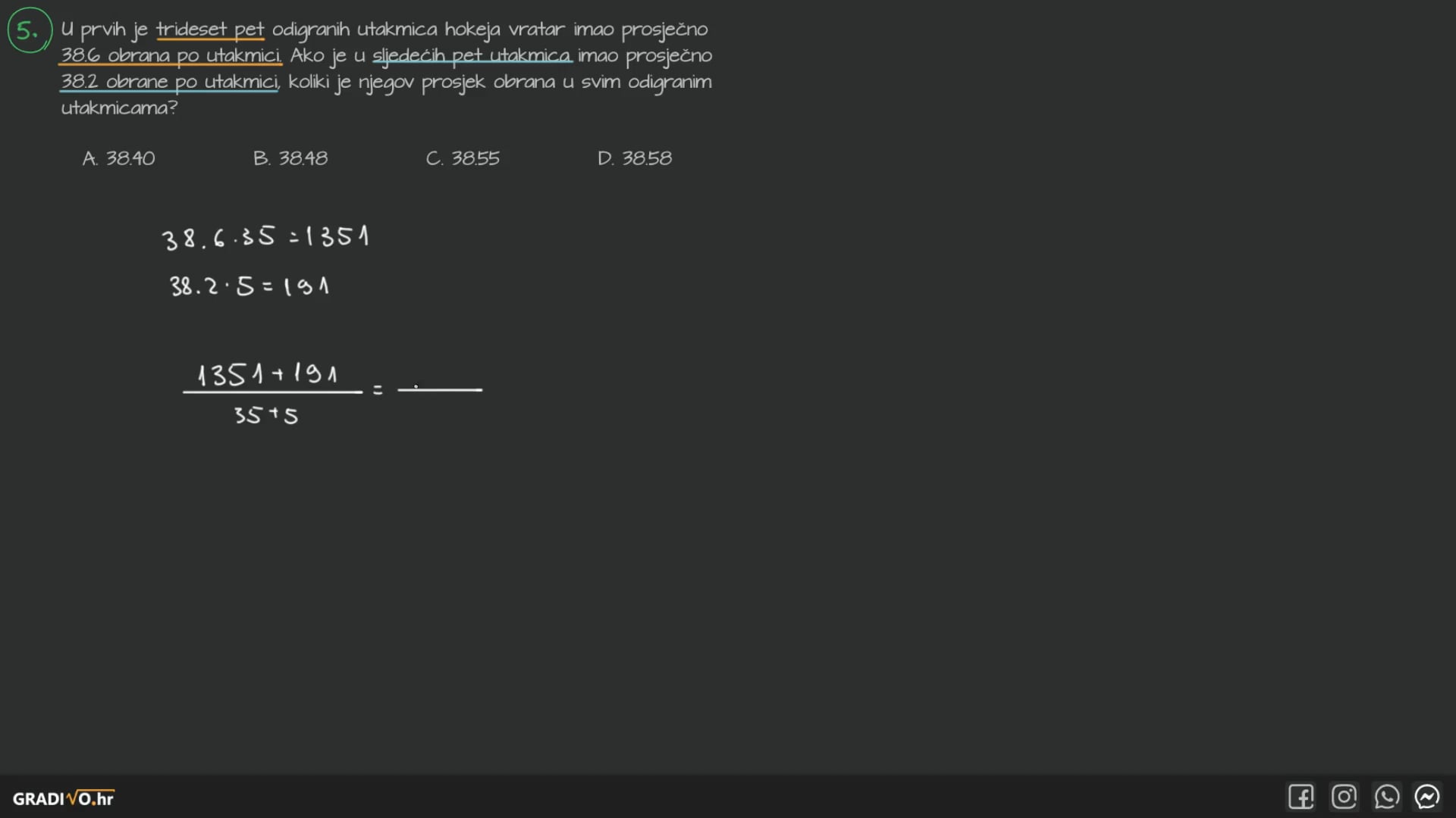 U prvih je trideset pet odigranih utakmica hokeja vratar imao prosječno 38.6 obrana po utakmici. Ako je u sljedećih pet utakmica imao prosječno 38.2 obrane po utakmici, koliki je njegov prosjek obrana u svim odigranim utakmicama?