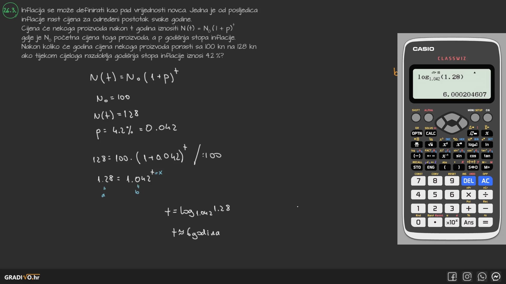 Inflacija se može definirati kao pad vrijednosti novca. Jedna je od posljedica inflacije rast cijena za određeni postotak svake godine. Cijena će nekoga proizvoda nakon $t$ godina iznositi $N(t)=N_{0}(1+p)^{t}$ gdje je $N_{0}$ početna cijena toga proizvoda, a $p$ godišnja stopa inflacije. Nakon koliko će godina cijena nekoga proizvoda porasti sa 100 kn na 128 kn ako tijekom cijeloga razdoblja godišnja stopa inflacije iznosi 4.2%?