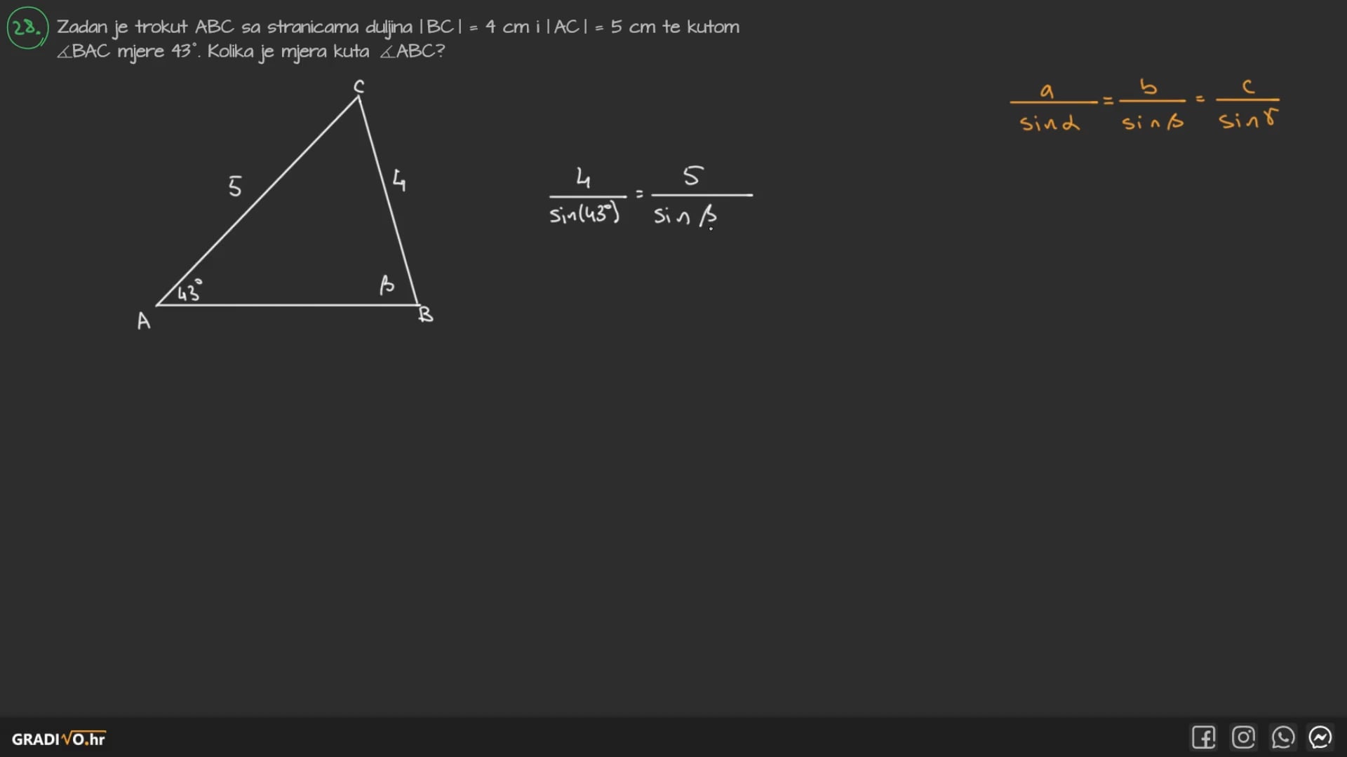 Zadan je trokut $A B C$ sa stranicama dulina $|B C|=4 \mathrm{~cm} \mathrm{i}|A C|=5 \mathrm{~cm}$ te kutom $\angle B A C$ mjere $43^{\circ}$. Kolika je mjera kuta $\angle A B C$ ?