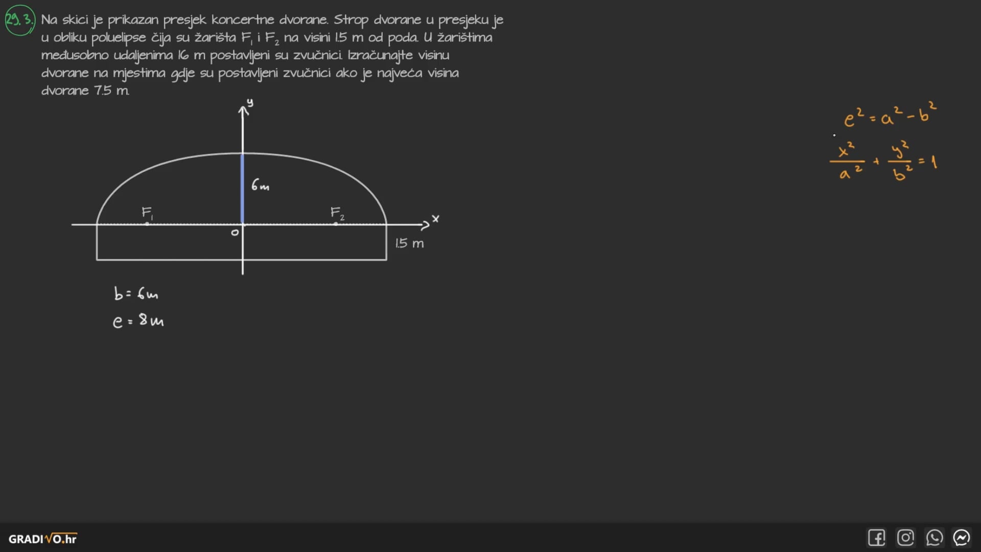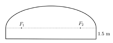 Na skici je prikazan presjek koncertne dvorane. Strop dvorane u presjeku je u obliku poluelipse čija su žarišta $F_{1} \mathrm{i} F_{2}$ na visini 1.5 m od poda. U žarištima međusobno udaljenima 16 m postavljeni su zvučnici. Izračunajte visinu dvorane na mjestima gdje su postavljeni zvučnici ako je najveća visina dvorane 7.5 m .