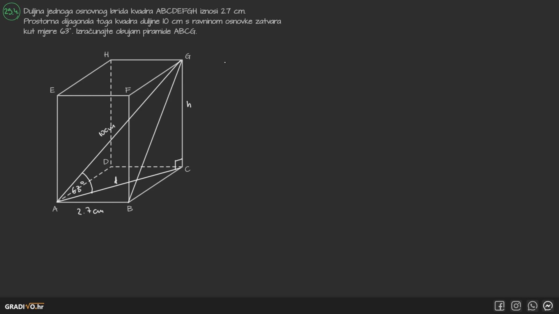 Duljina jednoga osnovnog brida kvadra $A B C D E F G H$ iznosi 2.7 cm . Prostorna dijagonala toga kvadra duljine 10 cm s ravninom osnovke zatvara kut mjere $63^{\circ}$. Izračunajte obujam piramide $A B C G$.