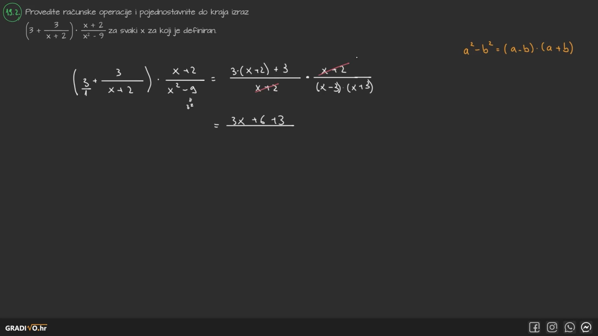 Provedite računske operacije i pojednostavite do kraja izraz $\left(3+\frac{3}{x+2}\right) \cdot \frac{x+2}{x^{2}-9}$ za svaki x za koji je definiran.