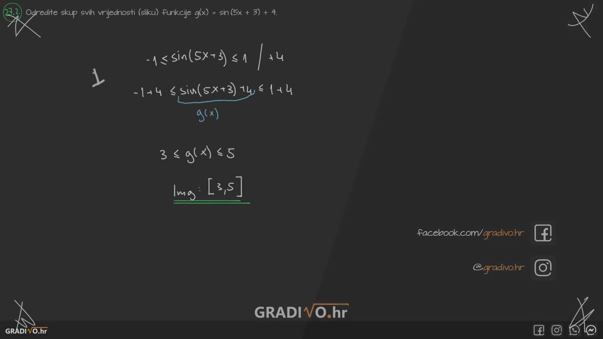 Odredite skup svih vrijednosti (sliku) funkcije $g(x)=\sin (5 x+3)+4$.