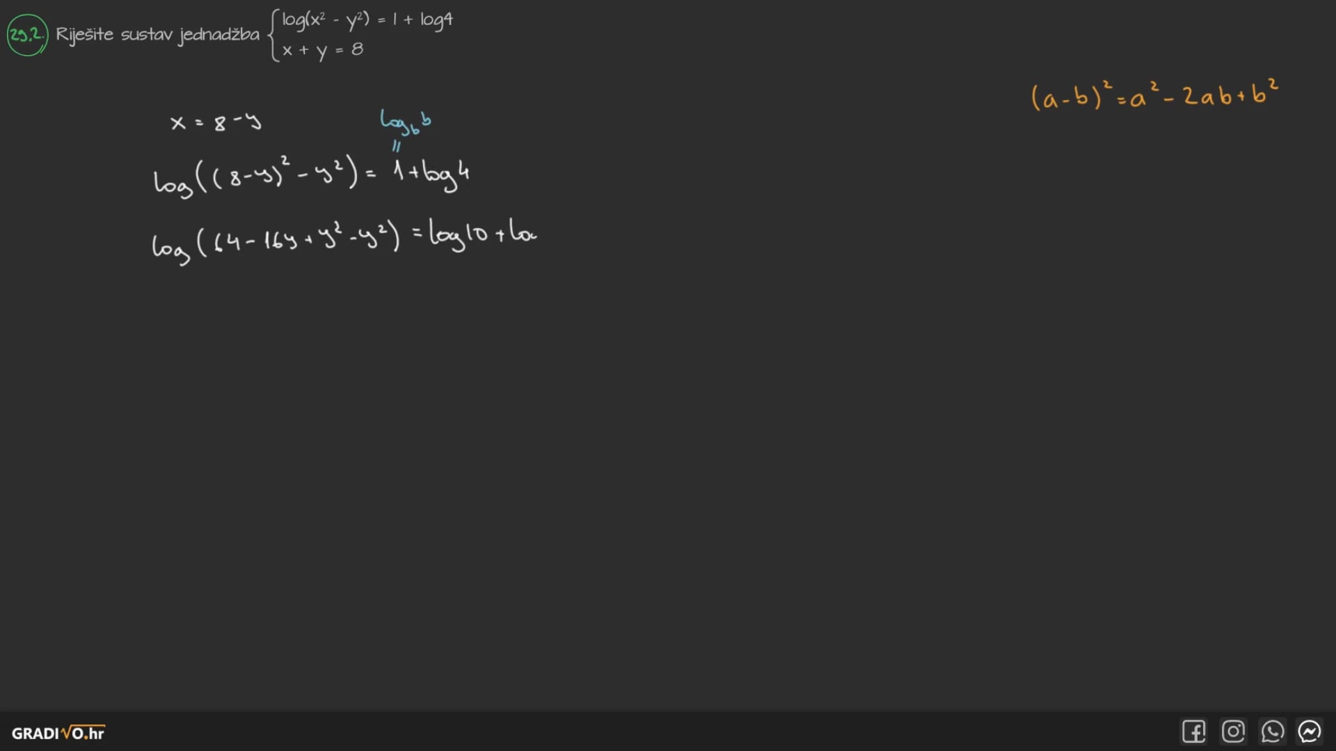 Riješite sustav jednadžba: $\left\{\begin{array}{l}\log \left(x^{2}-y^{2}\right)=1+\log 4 \\  x+y=8\end{array}\right.$