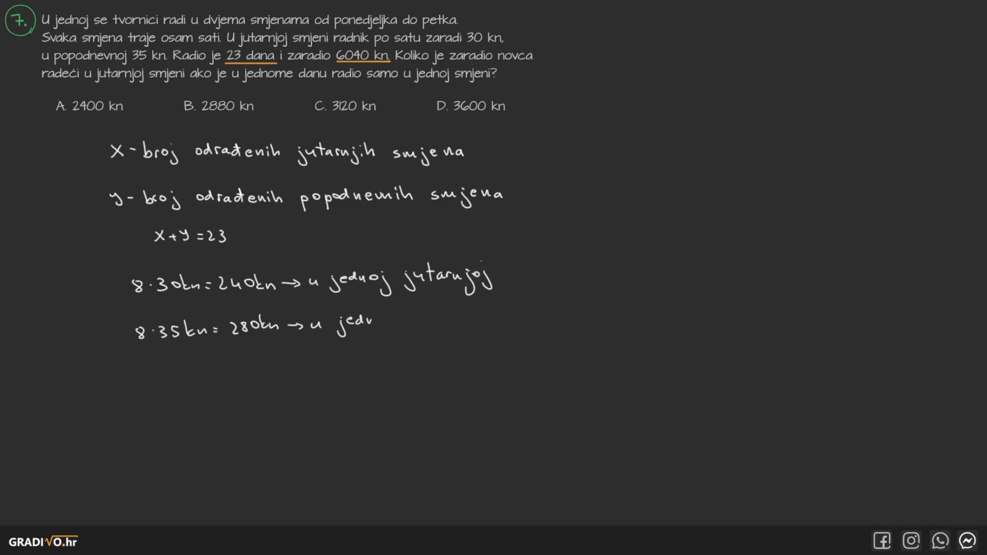 U jednoj se tvornici radi u dvjema smjenama od ponedjeljka do petka.Svaka smjena traje osam sati. U jutarnjoj smjeni radnik po satu zaradi 30 kn,u popodnevnoj 35 kn. Radio je 23 dana i zaradio 6040 kn. Koliko je zaradio novcaradeći u jutarnjoj smjeni ako je u jednome danu radio samo u jednoj smjeni?