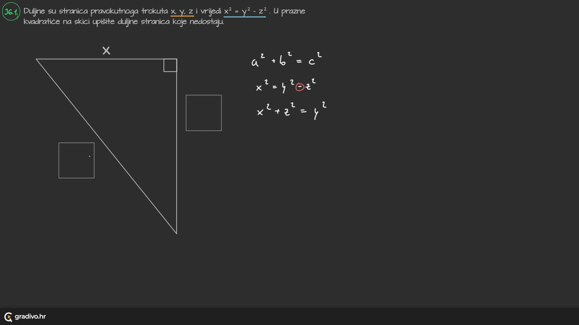 Duljine su stranica pravokutnoga trokuta $x, y, z$ i vrijedi $x^{2}=y^{2}-z^{2}$. U prazne kvadratiće na skici upišite duljine stranica koje nedostaju.
