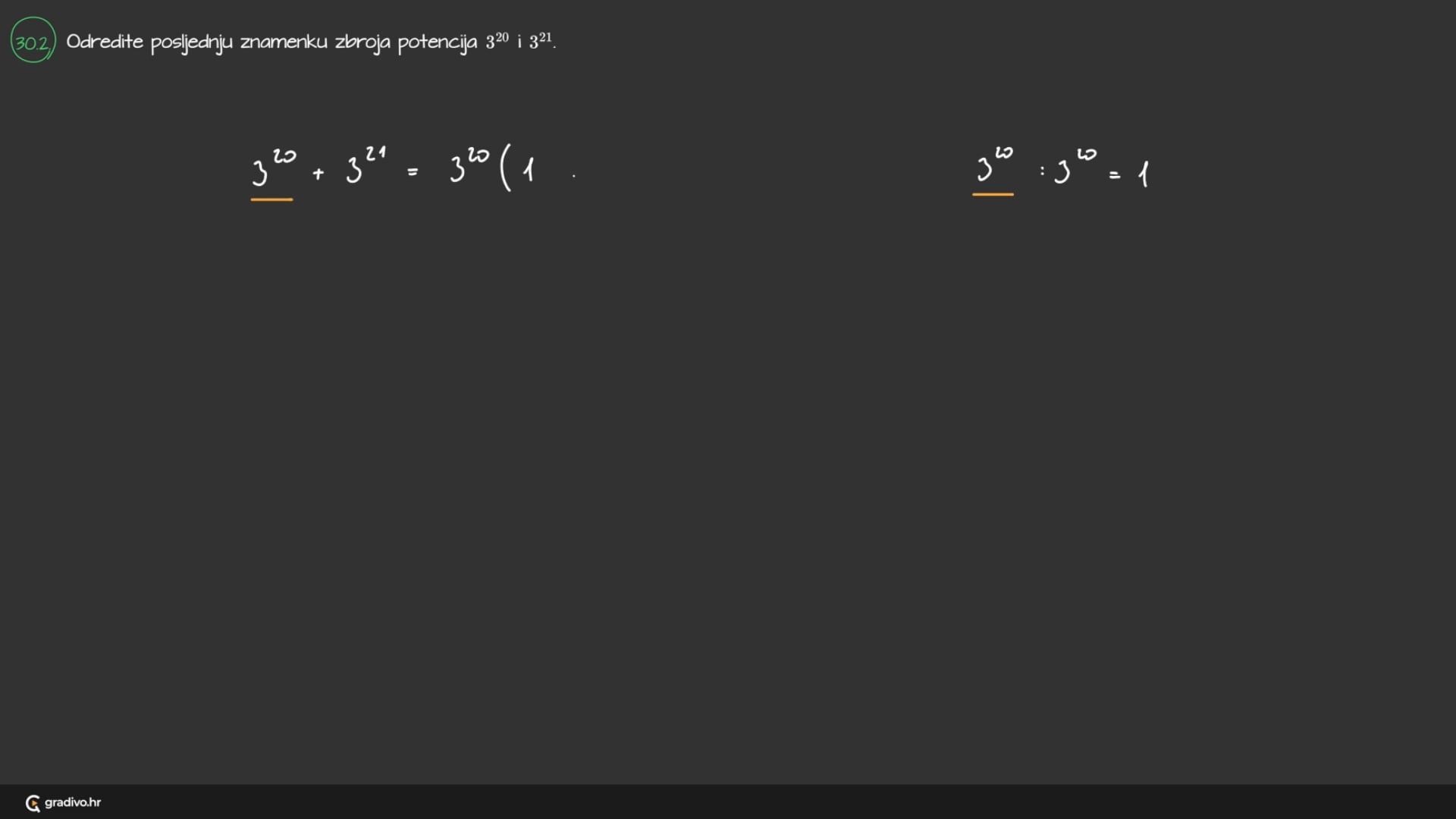 Odredite posljednju znamenku zbroja potencija $3^{20}$ i $3^{21}$.