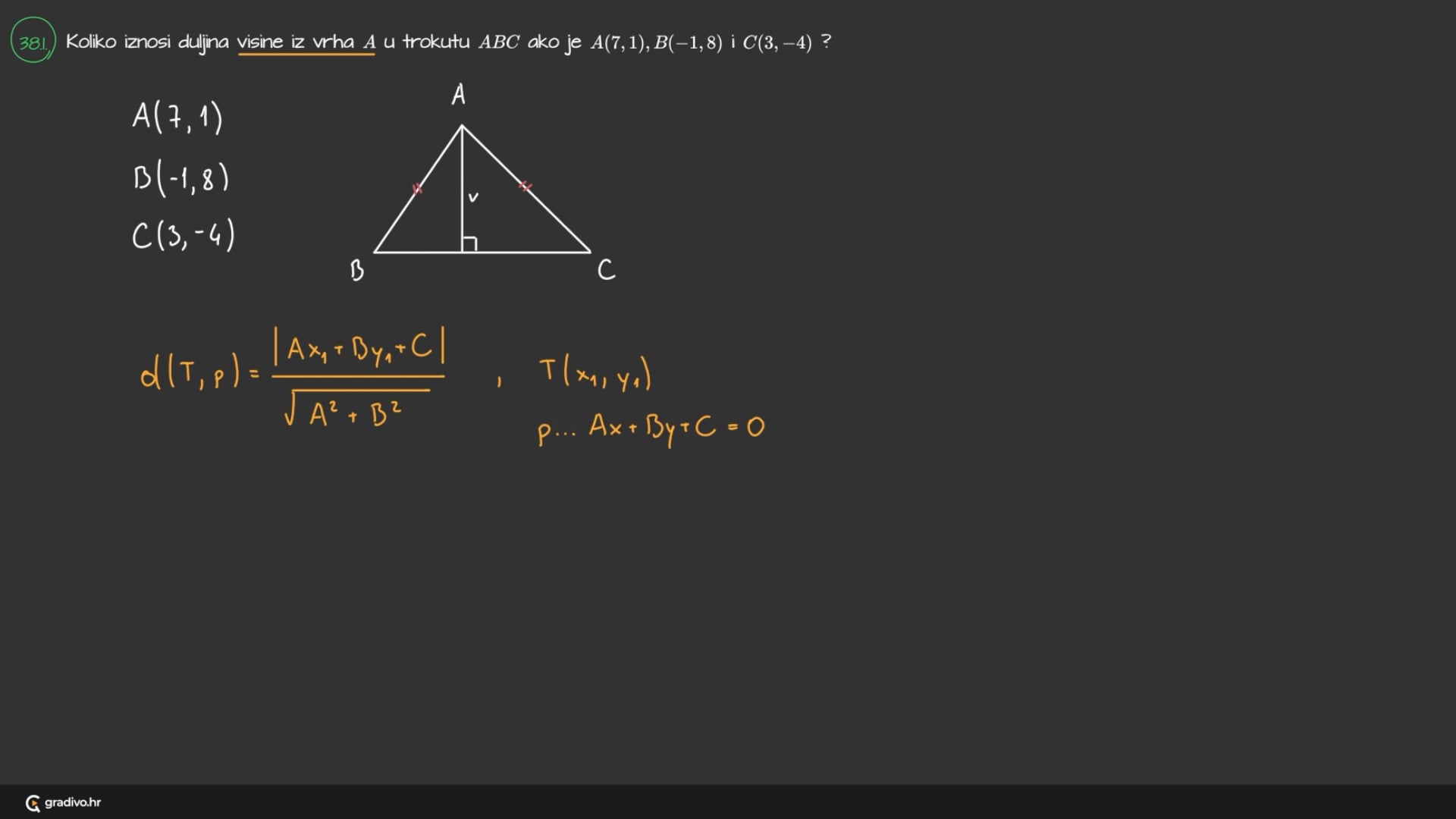 Koliko iznosi duljina visine iz vrha $A$ u trokutu $A B C$ ako je $A(7,1), B(-1,8)$ i $C(3,-4)$ ?