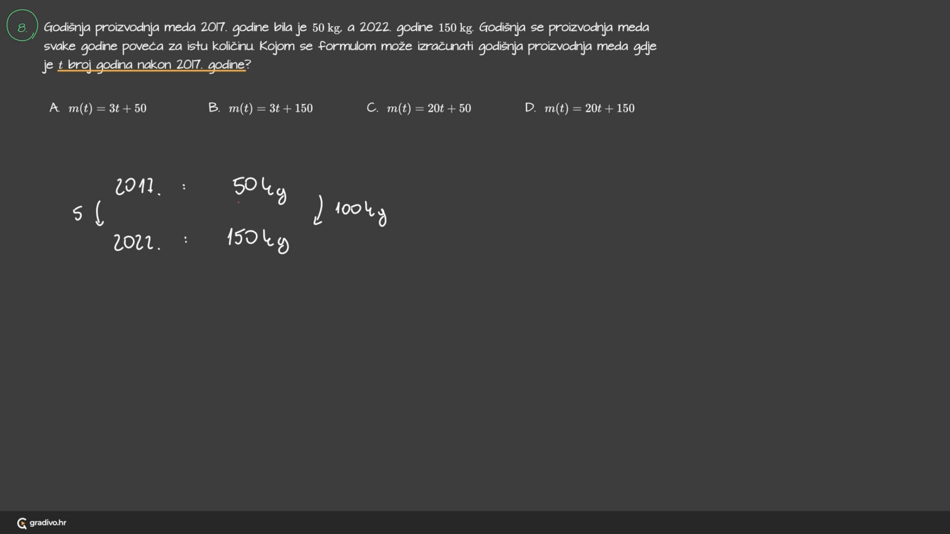 Godišnja proizvodnja meda 2017. godine bila je 50 kg , a 2022. godine 150 kg . Godišnja se proizvodnja meda svake godine poveća za istu količinu. Kojom se formulom može izračunati godišnja proizvodnja meda gdje je $t$ broj godina nakon 2017. godine?