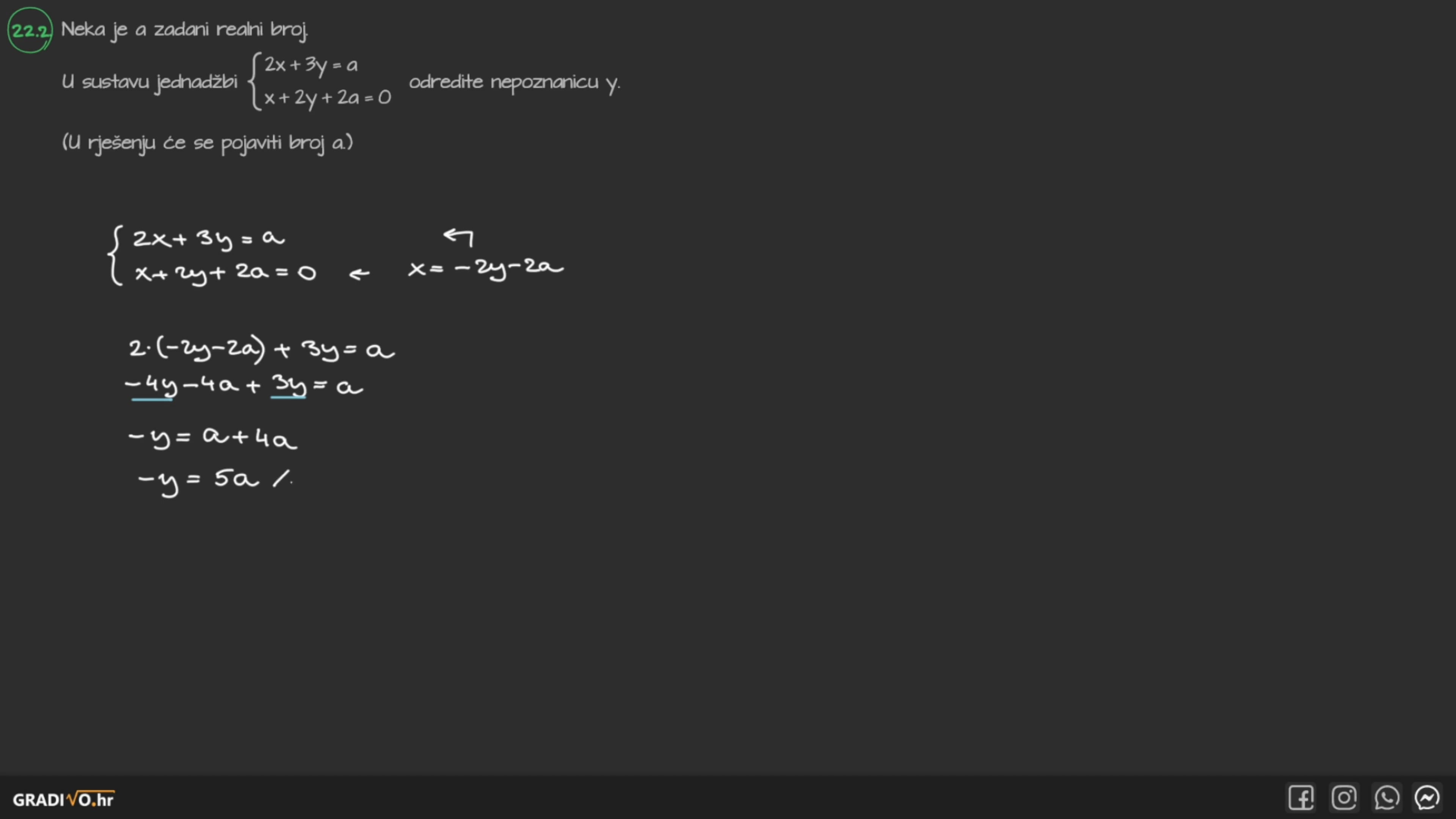 U sustavu jednadžbi $\left\{\begin{array}{c}2 x+3 y=a \\ x+2 y+2 a=0\end{array}\right.$ odredite nepoznanicu $y$.
